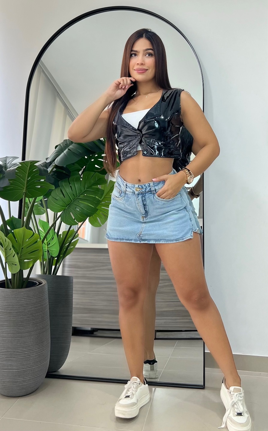 Gracias a su textura y corte, este chaleco se convierte en un básico diferente, perfecto para looks nocturnos, salidas especiales o combinaciones chic y arriesgadas. Ideal para usar con jeans, faldas o pantalones de tiro alto, logrando outfits impactantes con actitud.
