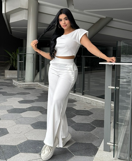 El rib acanalado se caracteriza por sus líneas en relieve, que aportan textura y ayudan a estilizar visualmente la silueta. El diseño del set incluye un top asimétrico de un solo hombro con manga corta, que le da un toque moderno y femenino, acompañado de un pantalón tipo palazzo de bota ancha, ideal para un look relajado y elegante.